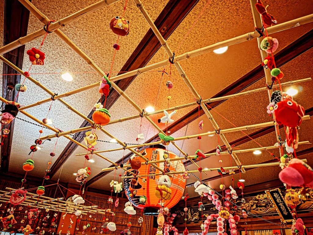 当山では、篤信のお檀家様が毎年この花飾りを作成下さっております。そのまま翌年の釈迦降誕会(花祭り法要)まで堂内にお飾りしさせて頂いております。